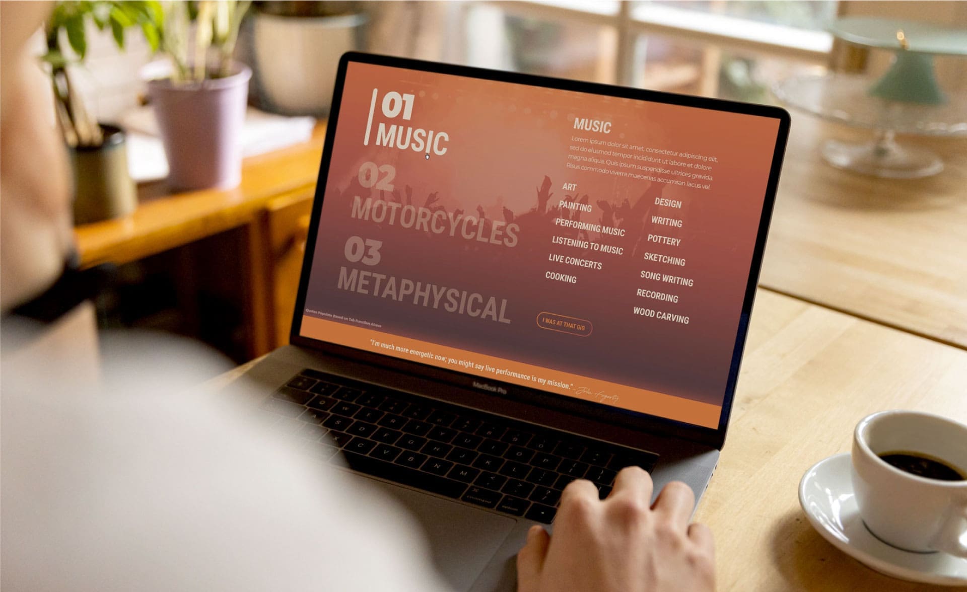 Rich Nisbet’s custom color palette included various shades of blues, oranges, and golds, while incorporating gradients throughout the site. These colors symbolize the brand’s boldness, determination, and confidence in the field of both metaphysical and material experiences. The custom logo comprises traditional elements, highlighting the subjects Music, Motorcycles, and Metaphysical with a 360 symbol to represent the entire person in a more spiritual sense.